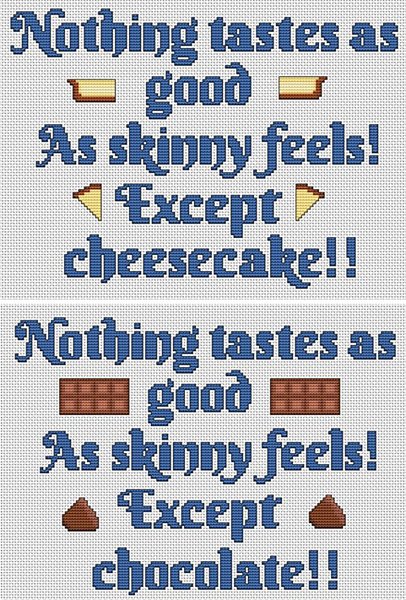 Skinny Part 1 is for those of us who love food and have a smart ass attitude! Some backstitching required. Each of the 2 charts will fit in an 8 x 10 frame if stitched on 14/28ct fabric.
